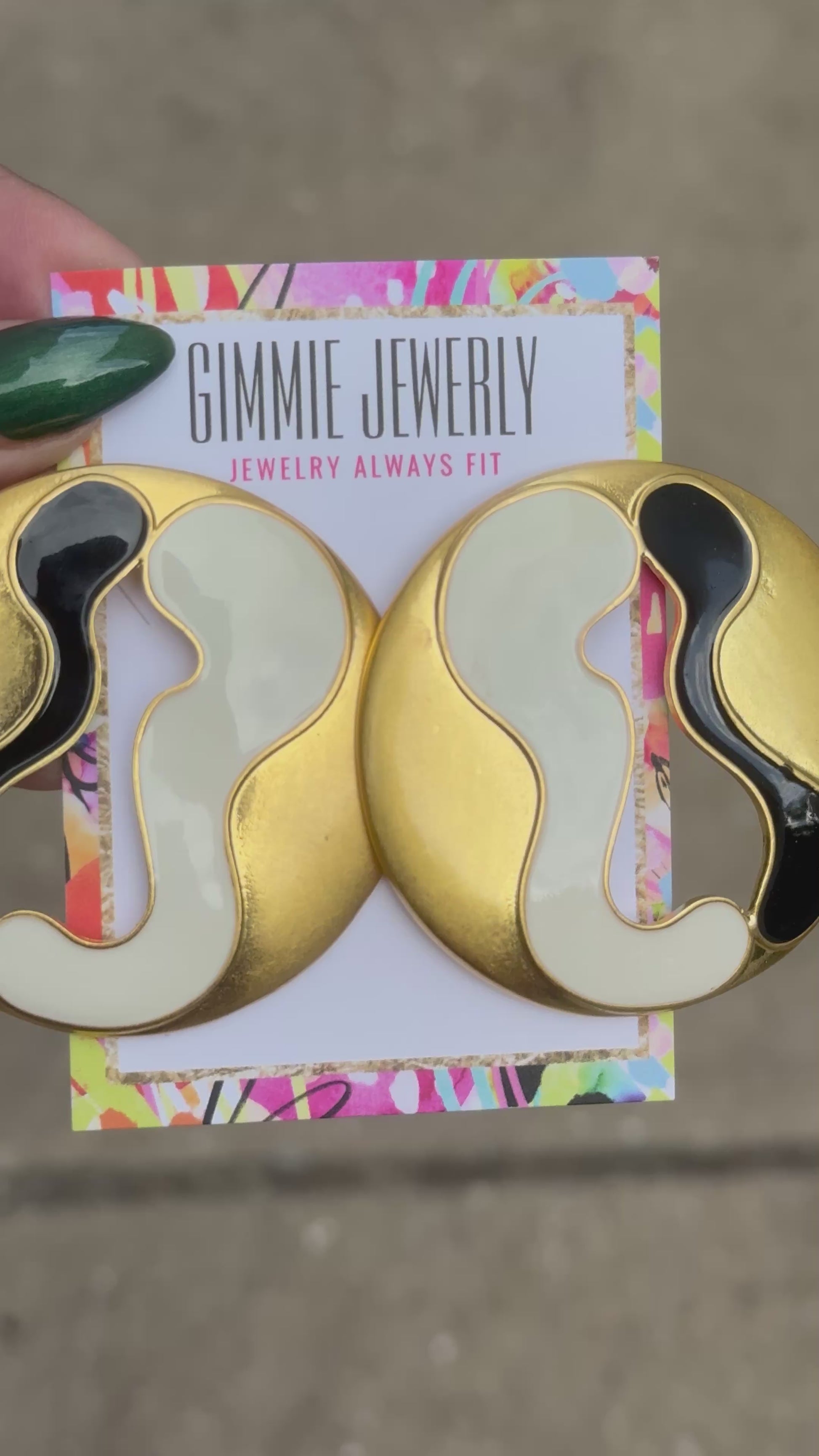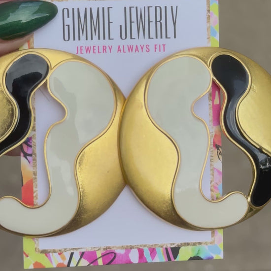 Turn heads with these bold and artistic statement earrings. Designed with a sleek round silhouette, these earrings feature a striking mix of gold, black, and ivory enamel in fluid, abstract shapes that give off a chic, modern vibe.